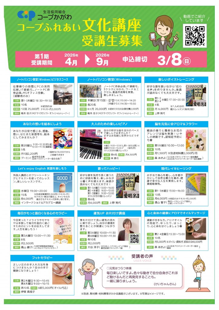 「コープふれあい文化講座」の受講生を募集しています!