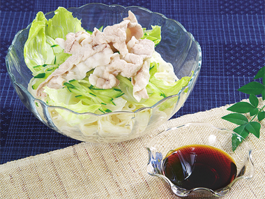 Fそうめんの上に、レタス、玉ねぎ、きゅうり、もち豚をのせて食べる直前にAのタレをかける。