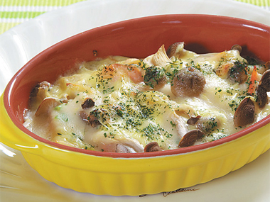 【材料】 カキ………………………500g 白菜…………………………………3枚 椎茸………………………4枚 ホワイトソース………………………1缶 カレールー………………1切 水…………………………………50cc バター…………………少量 【作り方】 @カキは海水程度の濃さの塩水で洗い水をきる。 A鍋で水50ccとカレールーを入れて火にかけて煮溶かす。 BAにホワイトソースをいれて混ぜておく。 Cフライパンでカキ、白菜、椎茸の順番で炒める。 Dグラタン皿にはバターを塗っておく。 ECに火が通ったらグラタン皿に入れてBのソースをかけて、オーブントースターで約5分焼く。 ※トースターによって焼く時間が異なりますので、ご注意下さい。 |