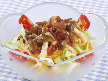 【材料】(2人分) レタス…………………… 3枚 人参………………………少量 ミニトマト…………………2個 ベーコン…………………1/2パック しめじ……………………1/4株 【作り方】 @レタスは少し太めの千切り、人参は細めの千切りにする。 Aベーコンはカリカリになるまで炒める。ベーコンがカリカリになったら、しめじを加えて更に炒める。 BAをキッチンペーパーの植えに置き、油をきる。 C@のレタスと人参を盛り付け、Bのベーコンとしめじをトッピングする。 Dお好みのドレッシングをかける。 |